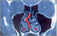 鼻腔の側壁から出ているヒダのようなものを下鼻甲介(上記写真の「」部分)といいます。粘膜が厚かったり、骨がとび出ていたりすると肥厚性鼻炎になります。症状は、とにかく鼻が一日中詰まりっぱなしで、点鼻薬(血管収縮剤)もだんだんと効果がなくなってきます。これを直すのが、粘膜下下甲介骨切除術(とびでている骨を削る)、下鼻甲介粘膜切除術(厚くなった粘膜を削る)です。
