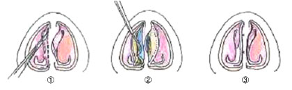 @ 鼻鏡で下甲介粘膜を観察、メスまたはサージトロンで下甲介粘膜前端部を切開。