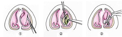 E 鼻中隔軟骨や骨の曲がっている部分を切除(ばりばりと音がしてご心配されるかもしれませんが、大丈夫です。)